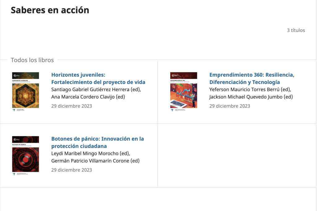 - “Horizontes juveniles: Fortalecimiento del proyecto de vida”, editado por Santiago Gabriel Gutiérrez Herrera y Ana Marcela Cordero Clavijo, una obra que reflexiona sobre la formación integral de los jóvenes y el acompañamiento educativo en la construcción de proyectos de vida.